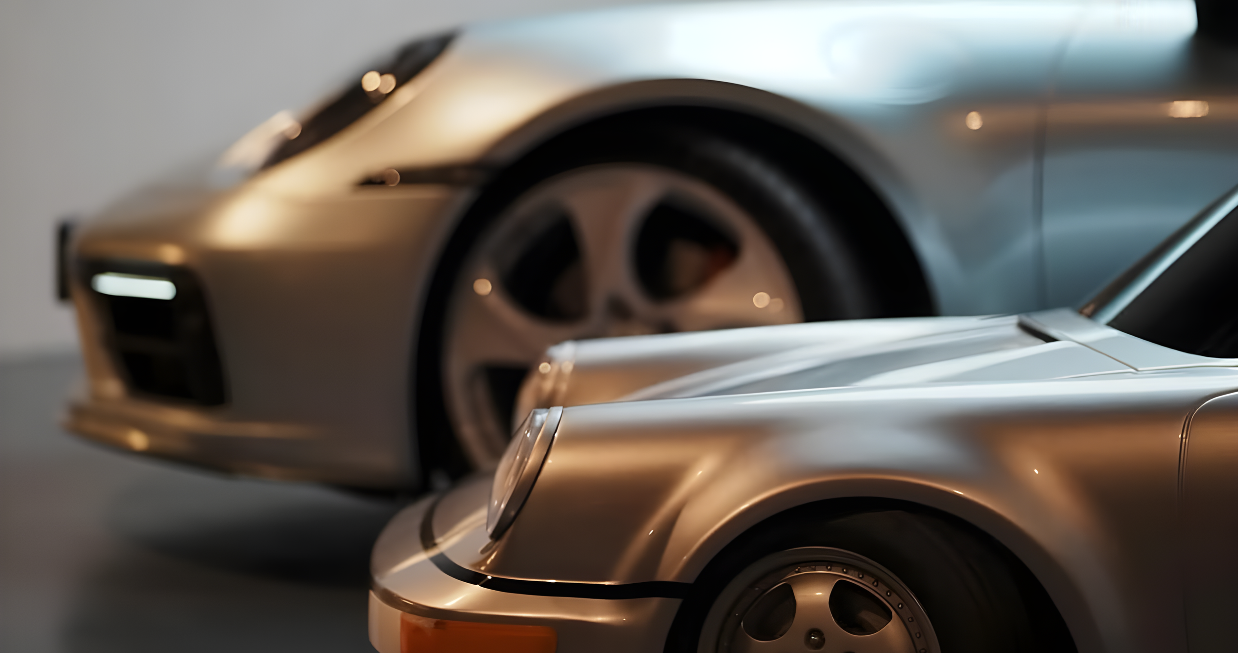 Comparison of Porsche sports car and replica kart, one modern with a silver body and one vintage with a gray body, both in a dark indoor setting.